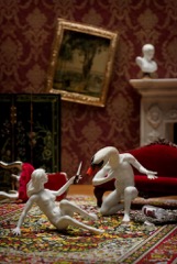 In this ongoing series, “Short Stories/Tall Tales,” the artwork addresses anxieties common to adulthood through child-like fantasy scenes. The use of miniature characters, constructed sets and vivid colors allows Weston to play with weighty issues in a lighter way. The selections for Art·tri·bu·tion from Short Stories/Tall Tales either have references to an artist, art piece(s) or art style or movement.