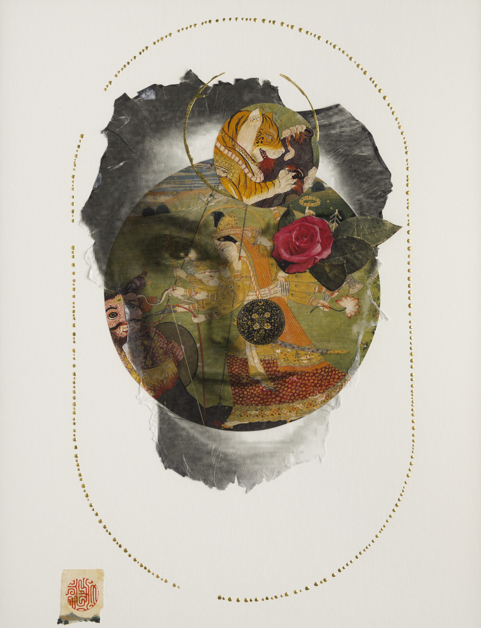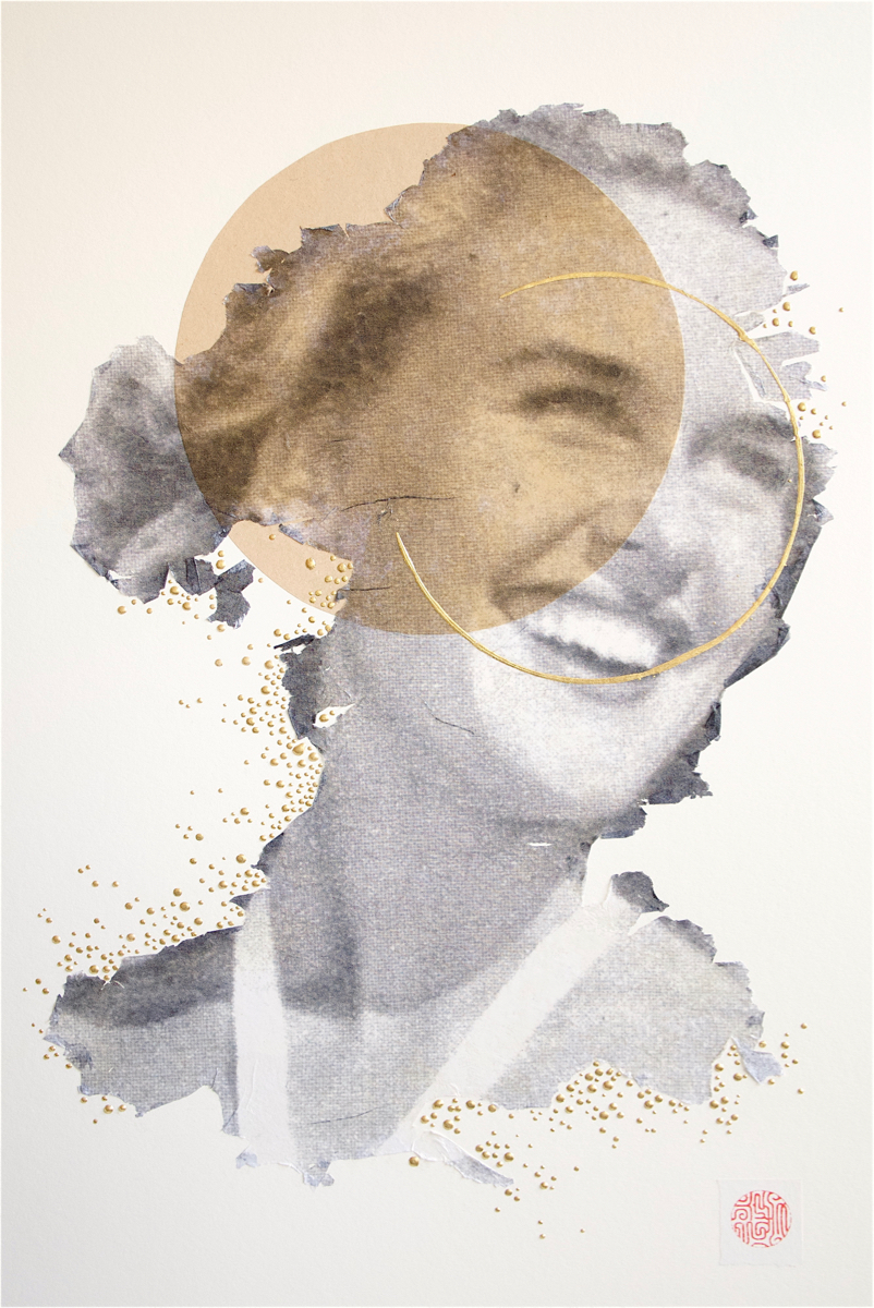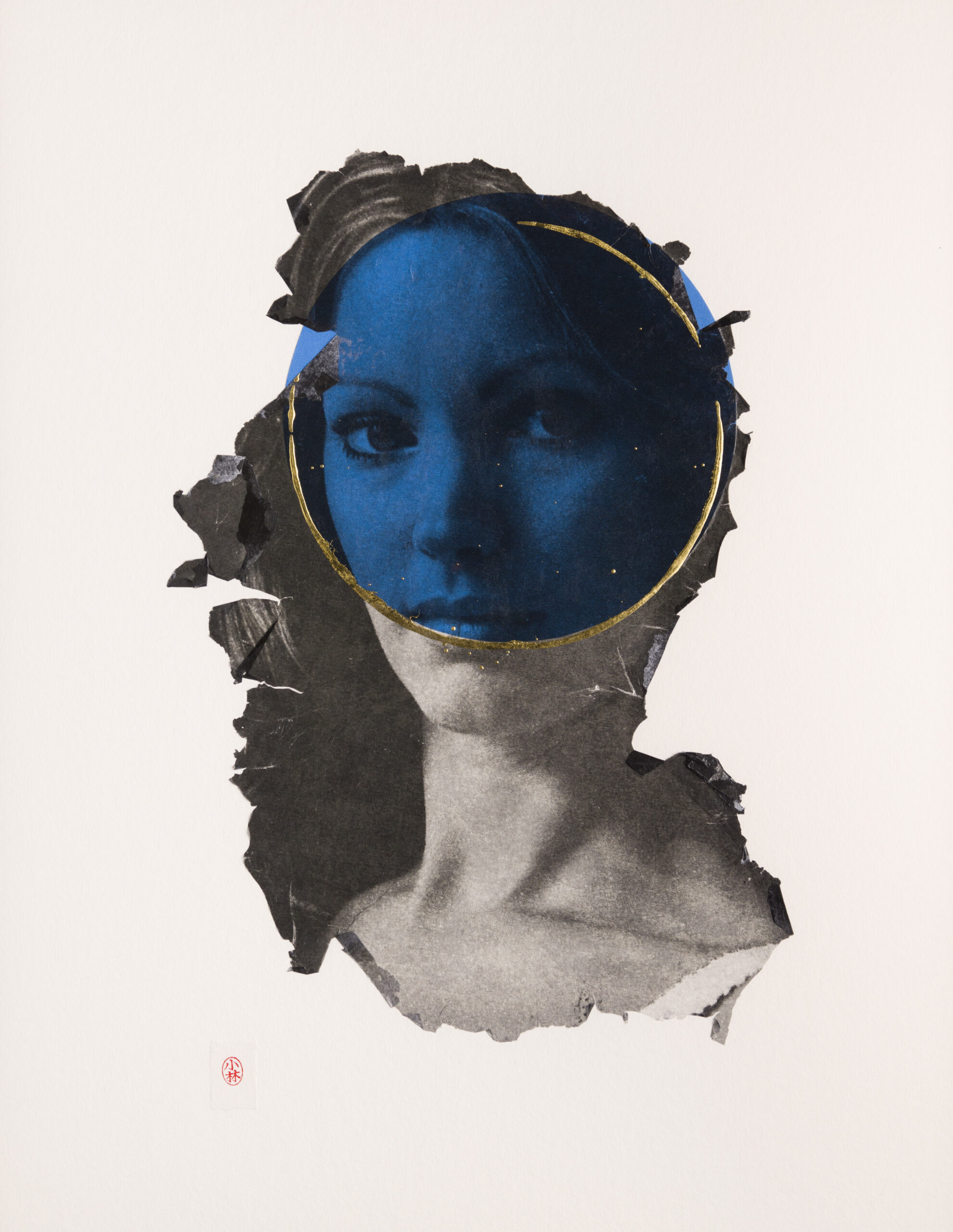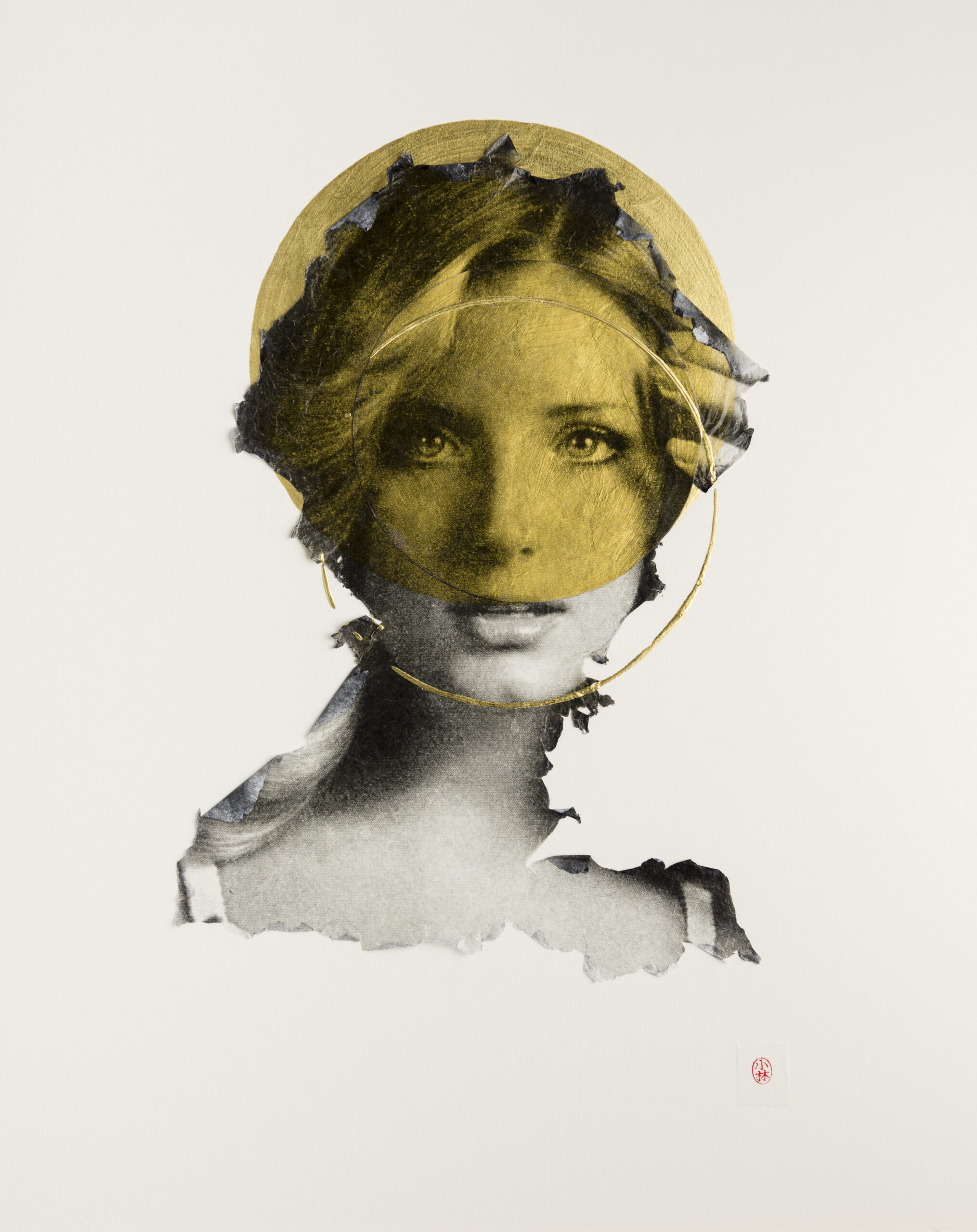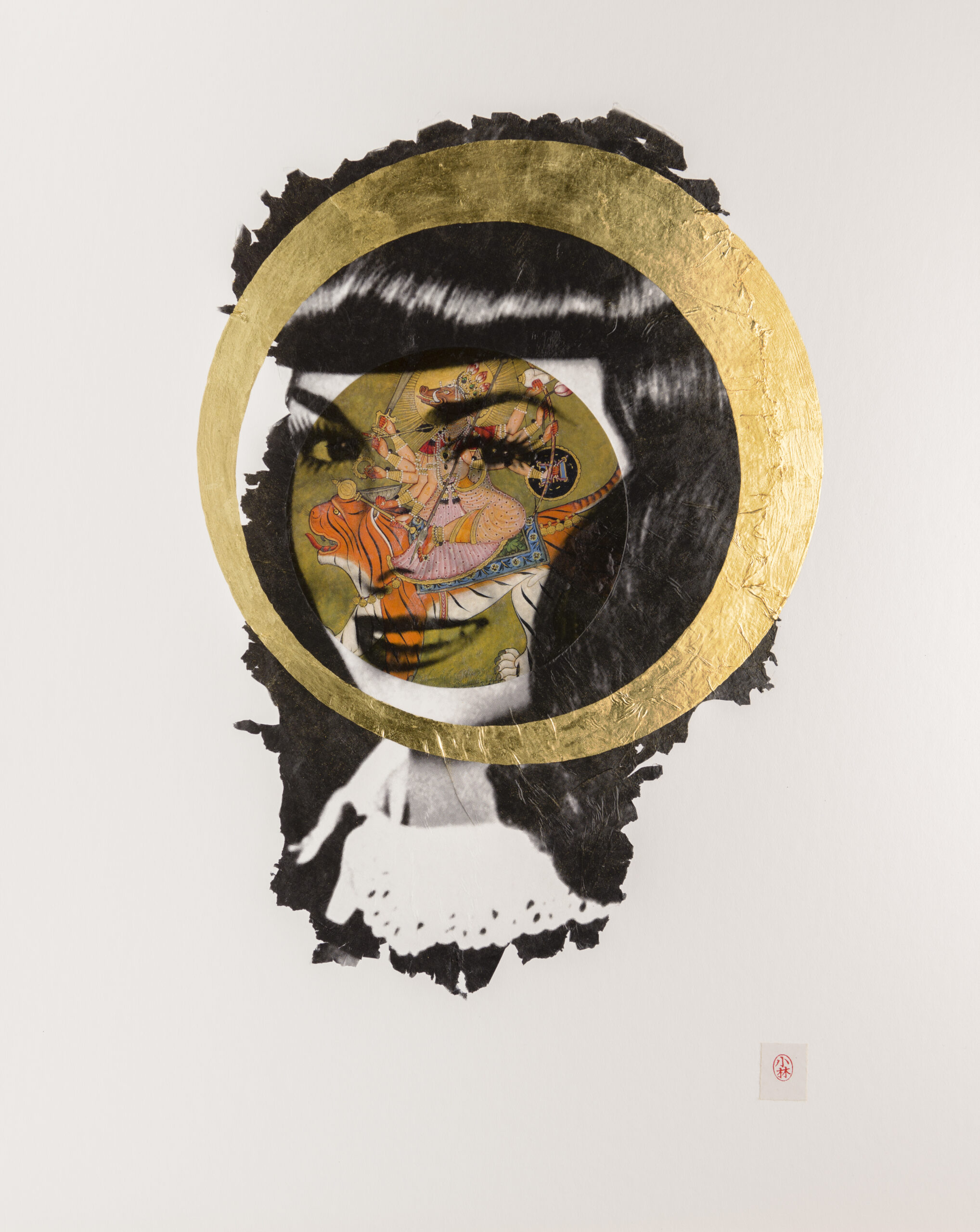 My academic background is in Religious Studies, with a Buddhism and Art concentration. My art reconciles this background with my interest in the effects of popular culture on feminine identity. In school, I was most influenced by my study of Zen painting and calligraphy and Japanese woodblock prints. Along with my preference for paper, the aesthetic of my portraits is largely informed by my interest in the art of Japan, including my use of negative space and the way I sign my pieces with a red ink seal. Also, the expressiveness of the eroded edges of my image transfers recalls brushstrokes in Japanese ink painting and calligraphy. Currently, as a professor of World Religions, I have a renewed interest in Hindu imagery, especially depictions of female deities. I notice parallels between the poses, gazes, and hand gestures of fashion models in advertising and deities in Buddhist and Hindu art. As a result, the way I combine religious imagery with commercial images of women, creates a pantheon of sorts. The women featured in my work strike me as familiar, but with a difference; they stand out to me because I see something out of the ordinary in them. After years of working with these catalogs, I’ve developed an emotional relationship with the models, many of whom reappear in the catalogs year after year. I see in their poses a dignity and strength that stands in sharp contrast to contemporary representations of women in advertising. My impulse is to reinterpret their roles as divine beings, thereby activating a subjectivity that the original context of these images obscures.