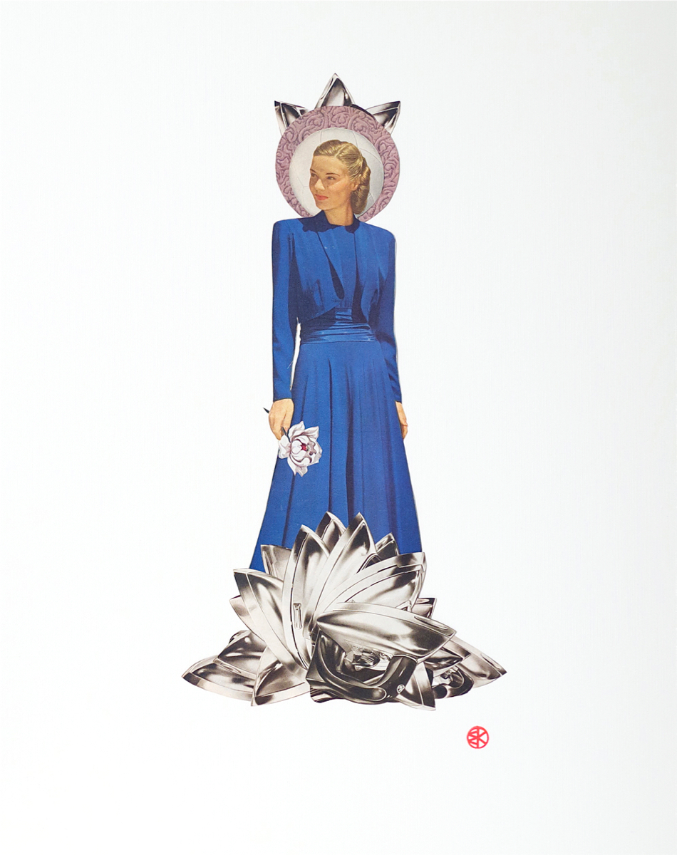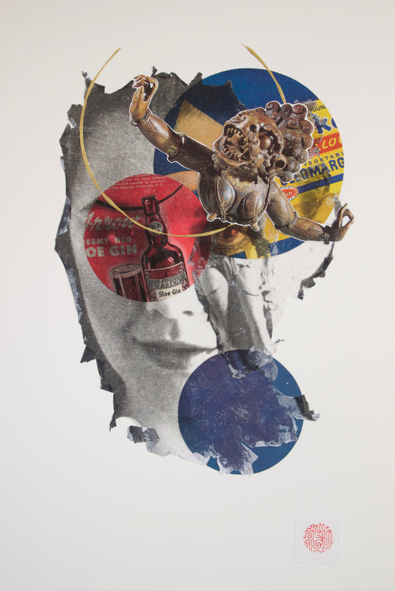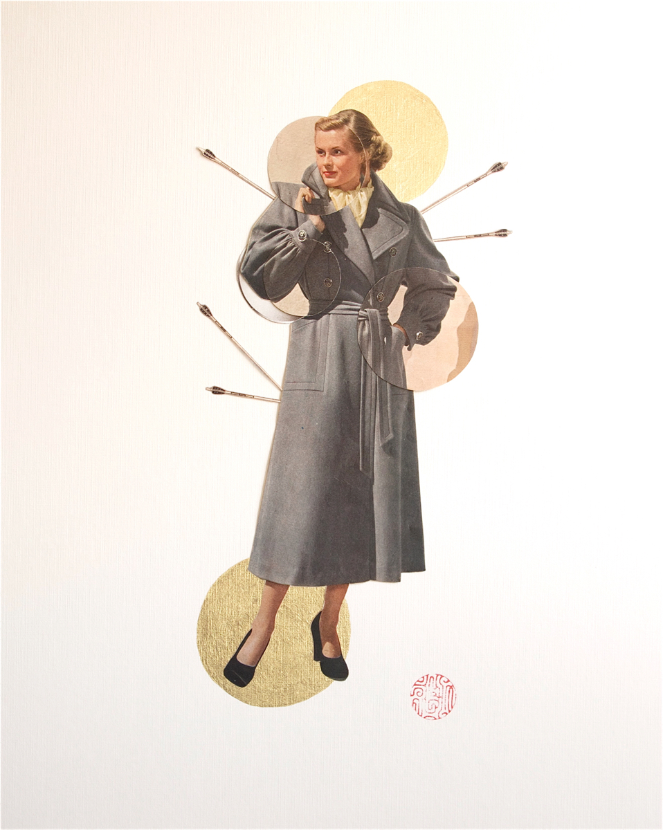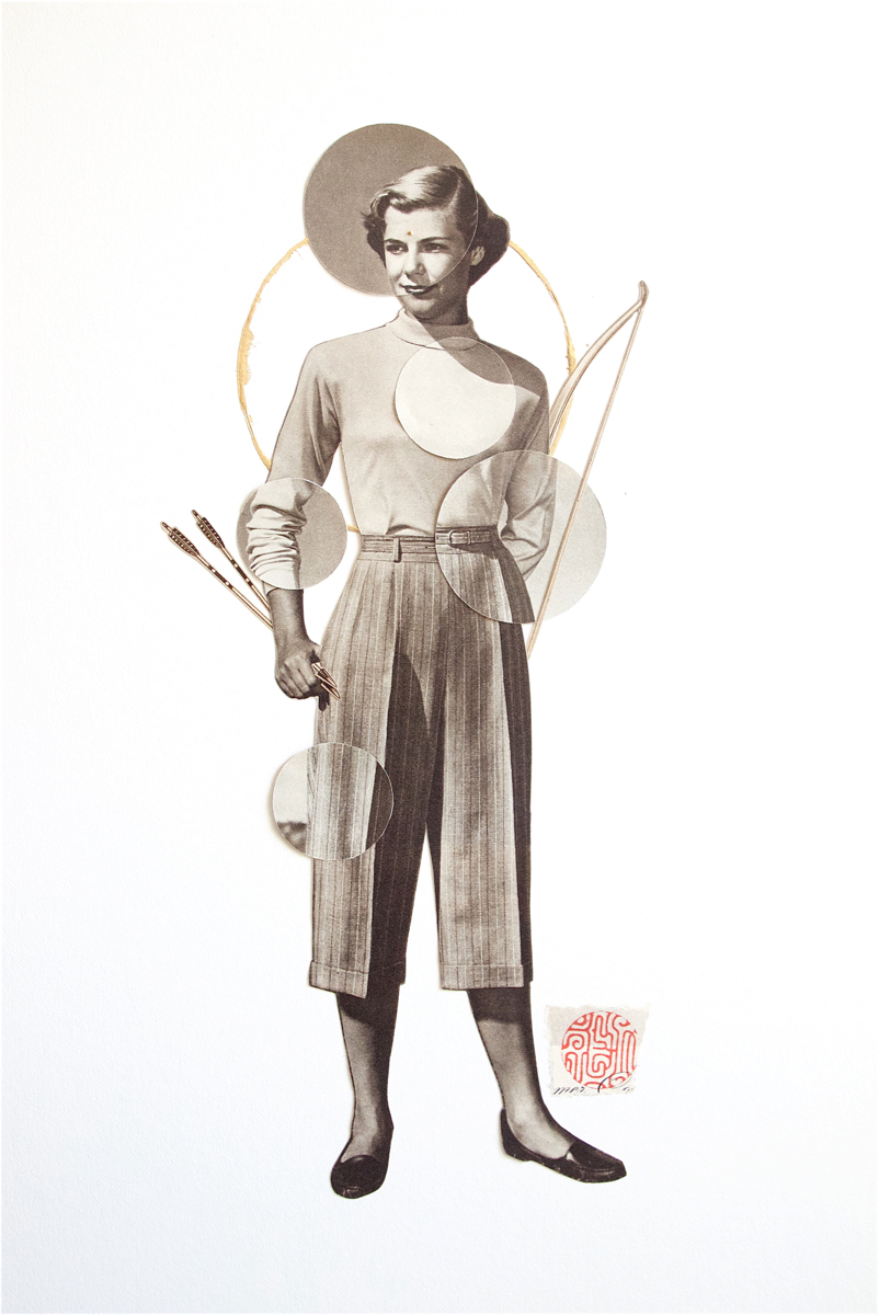 My current work started as an archival exercise, isolating and distilling the cultural messages packed into the pages of American mail-order catalogs, with a sharp focus on popular portrayals of women. Over the past three years, I’ve created two distinct yet related series of portraits from these catalogs. My collage portraits are hand-cut from the original 1940’s catalog pages, and feature reworked fashion models as super-heroines and goddesses. My image transfer portraits incorporate elements of collage, photography, and calligraphy, and depict women from 1970’s bra ads as fierce deities, and 1940’s models as compassionate ones. As a unified body of work, this collection of contemporary portraiture combines a documentation of popular representations of women in advertising with an attempt to obliterate the collective meaning of this representation.