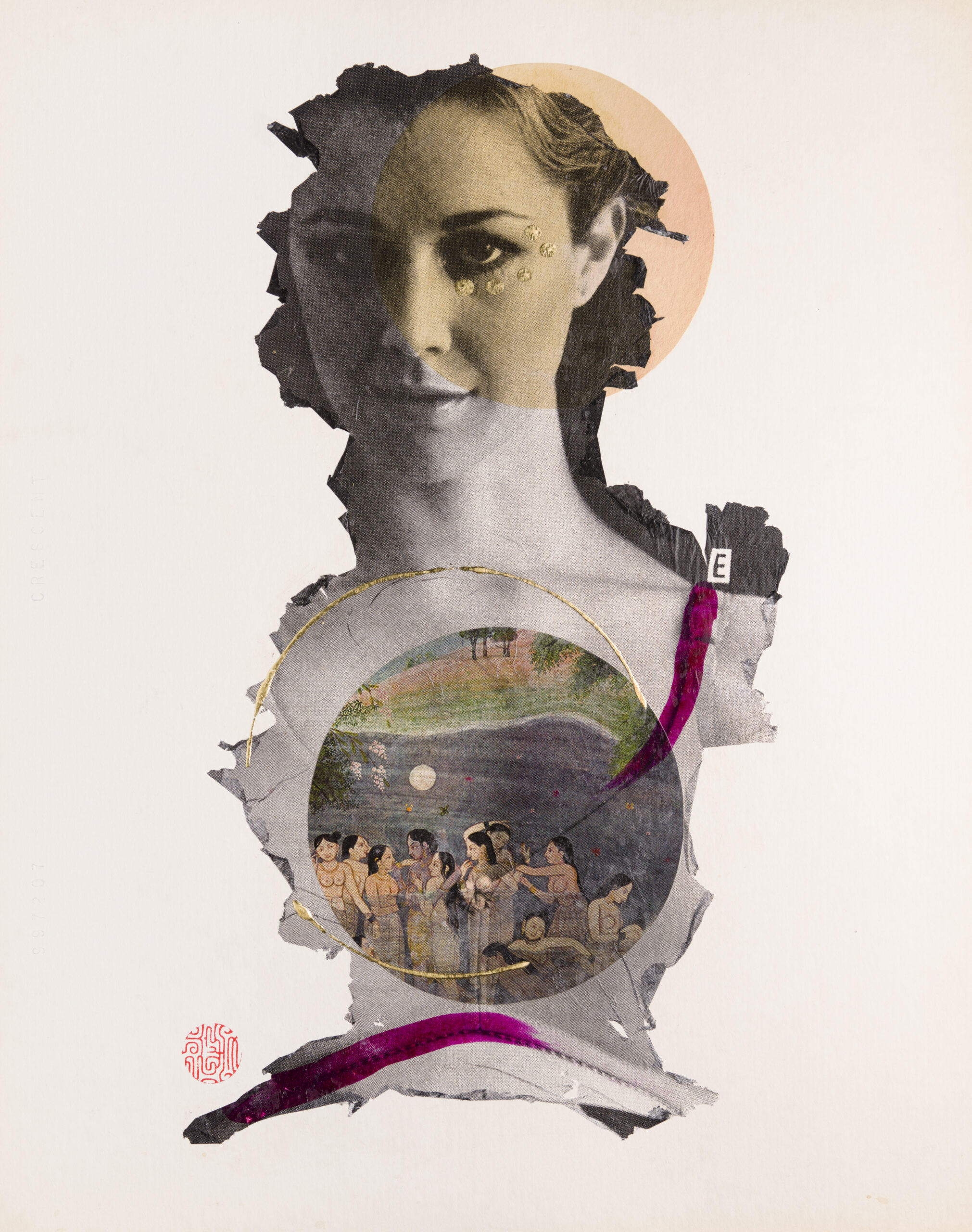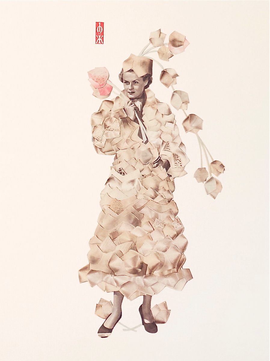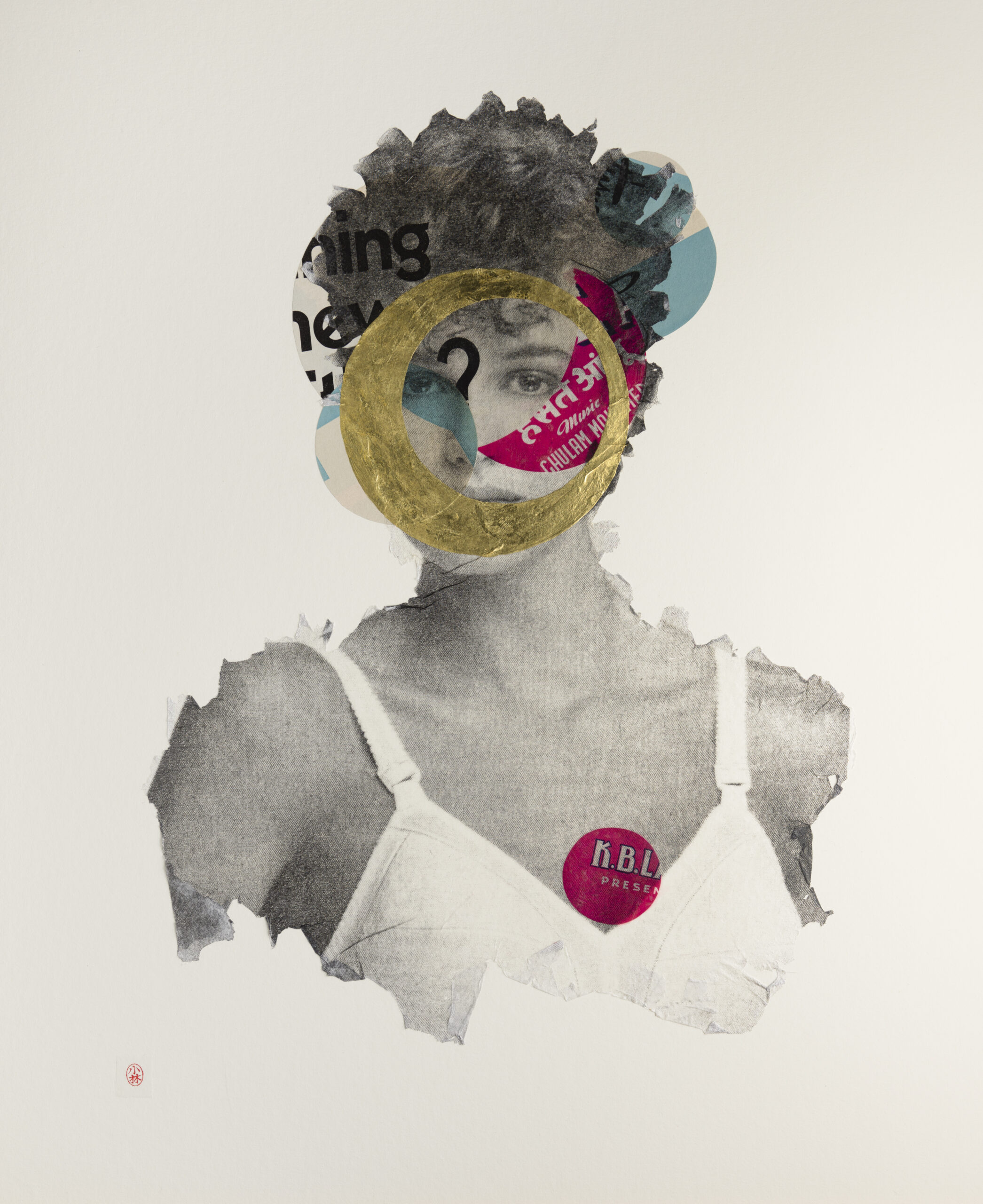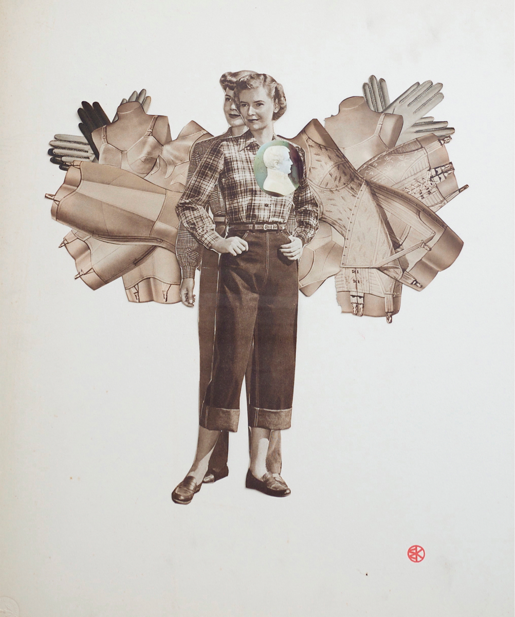 My current work started as an archival exercise, isolating and distilling the cultural messages packed into the pages of American mail-order catalogs, with a sharp focus on popular portrayals of women. Over the past three years, I’ve created two distinct yet related series of portraits from these catalogs. My collage portraits are hand-cut from the original 1940’s catalog pages, and feature reworked fashion models as super-heroines and goddesses. My image transfer portraits incorporate elements of collage, photography, and calligraphy, and depict women from 1970’s bra ads as fierce deities, and 1940’s models as compassionate ones. As a unified body of work, this collection of contemporary portraiture combines a documentation of popular representations of women in advertising with an attempt to obliterate the collective meaning of this representation.
