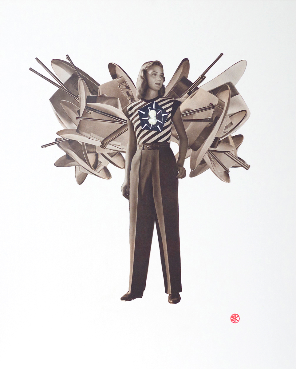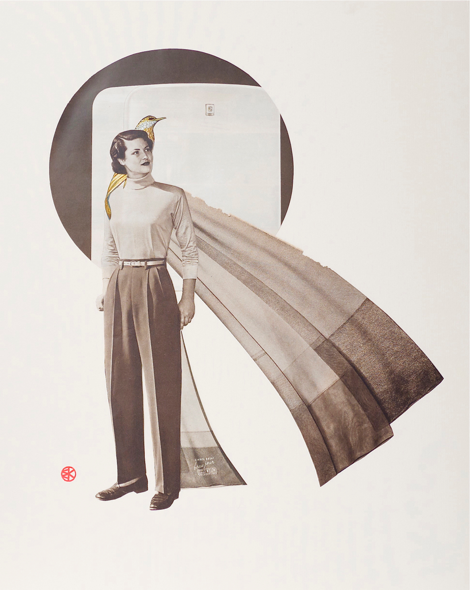 Blythe King’s art reconciles her background in Religious Studies with her interest in the effects of popular culture on female identity. Featuring reworked images of fashion models from American mail-order catalogs from the 1940’s and 70’s, Blythe’s collage and image transfer portraits suggest that through a process of transformation, we may see more clearly the work of culture on women’s bodies.