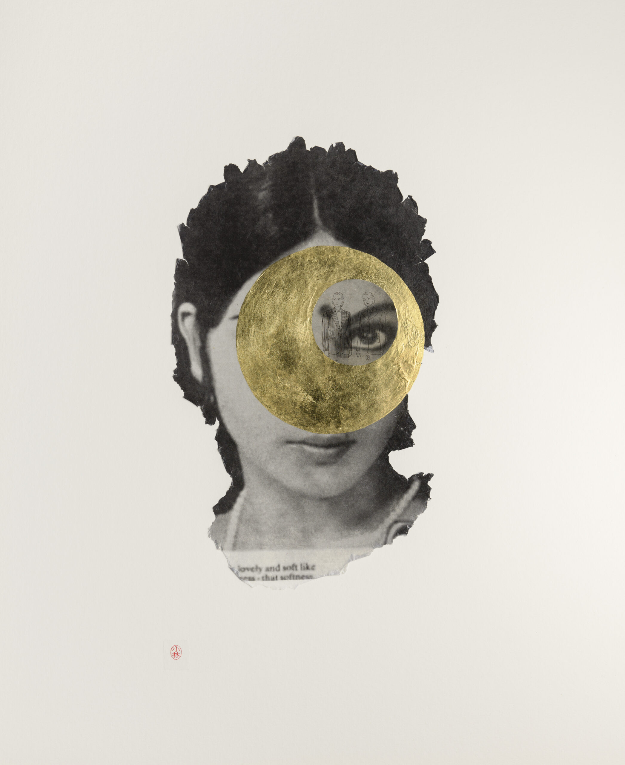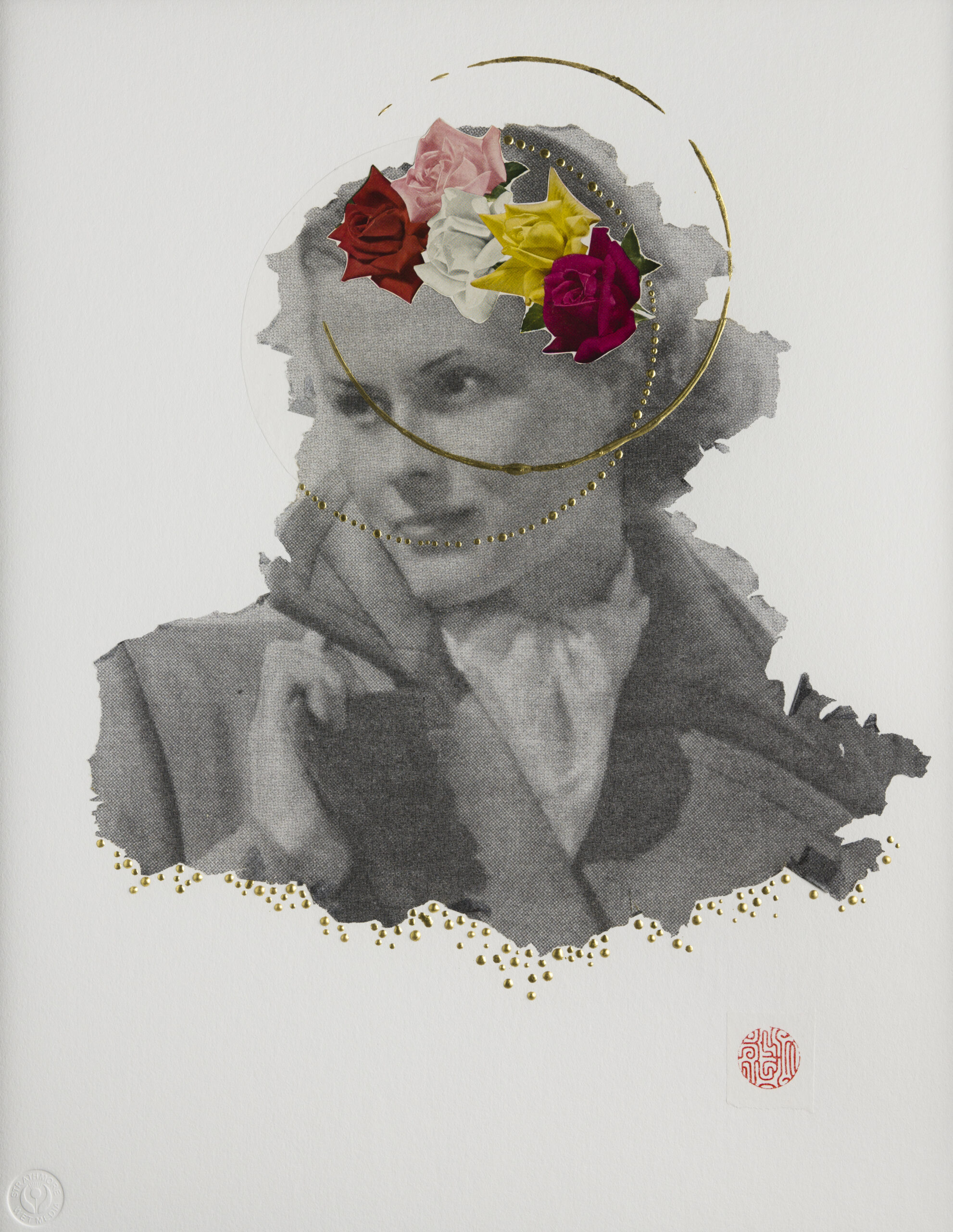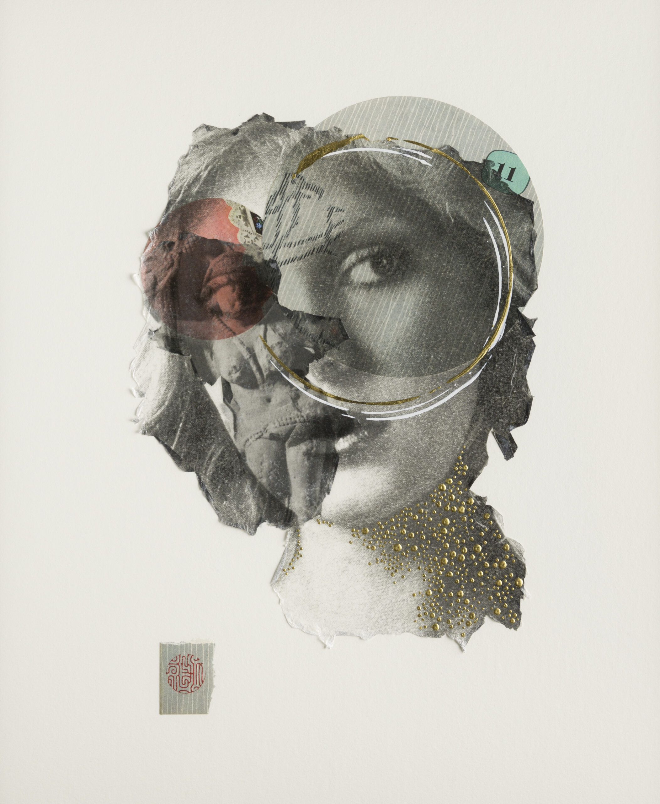 This transformation of image and meaning offers the viewer an opportunity for a shift in perspective. Through collage and image transfer, I layer various materials and markings, like old paper, fingerprints, and gold rings, suggesting that through a process of transformation, we may see more clearly the work of culture on women’s bodies. My work considers the influence of the exterior, projected feminine ideal on interior ideas of identity, and ways in which the values of the dominant culture are encoded in commercial images of women. I find that these models of femininity are worth another look to allow for other ways of seeing them.