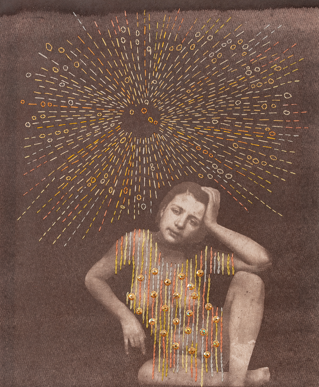 During a year-long illness, I spent more time looking at photographs in books than making them. A series of anonymous nudes from various sources, all made between 1843-1910 entered my consciousness and kept me restless. It was not just the finality of the title, “anonymous”, but wonder about the relationship between photographer and subject. I found myself dreamily inventing backstories and imagining what they might have been like outside the photographers studio. To satisfy my curiosity, I scanned the original reproduction to digitally remove them from the studio. Then I began creating an alternate place and time. I embroider, and sew clothing as a gesture of renewal and second chances. Each sewn photograph is a unique echo of the original, akin to a distant, imagined descendent. I gratefully acknowledge the collectors and institutions who collected and preserved the original moments. – EB