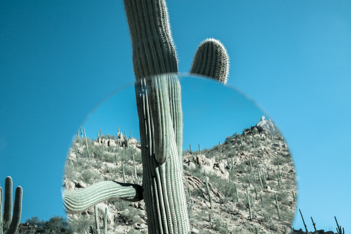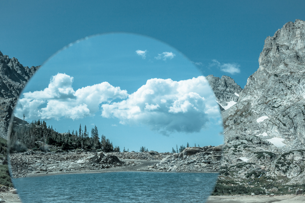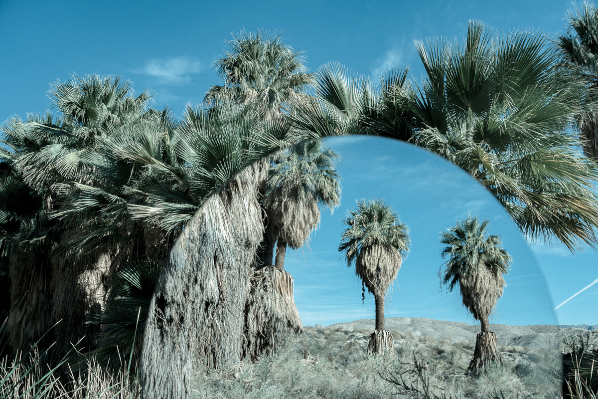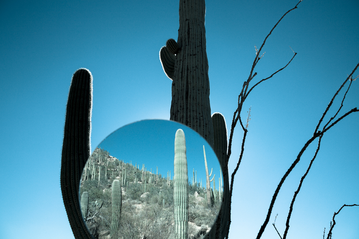 essentially an acknowledgement of the importance of the camera’s coordinates in space or the vantage point of the maker. I use a mirror within the landscape as a way to combine two vantage points – in front and behind me – in one frame. Representation of photographic seeing tends to be from one vantage point or coordinate in space – you extend a ray from your eye to the scene. I’ve often felt this is a representational limitation since what we may experience as seeing is a three dimensional, multi-sensorial experience. By creating images that combine multiple scenes–albeit from the same vantage point–my aim is to create a two-dimensional image that evokes a more whole representation of seeing. The series locked into place when I realized I could line up horizon lines from these multiple spaces or line up objects–clouds and rocky peaks, for instance–to unify different spaces within the singular frame. Though the idea of landscape may carry with it certain metaphors, I use the landscape as a sort of blank canvas or background layer (to use the language of Photoshop) devoid of social cues or commercial symbols. I use a circular mirror as a reference to the shape of the eyeball and to the fact that all images — whether formed in the brain or projected onto the capture plane — are created optically as true circles. -KH