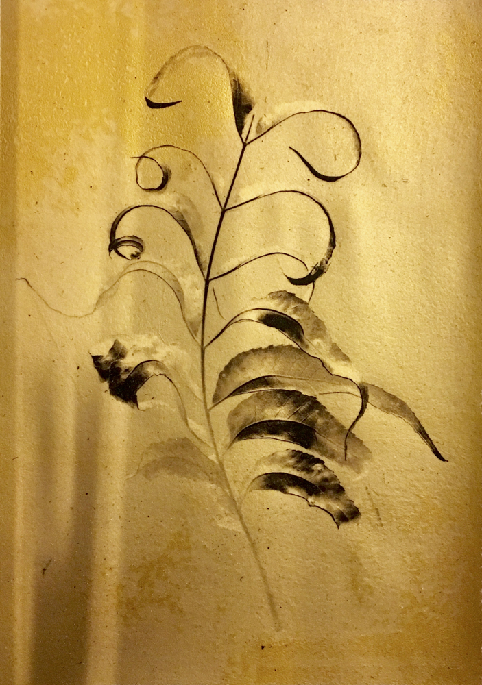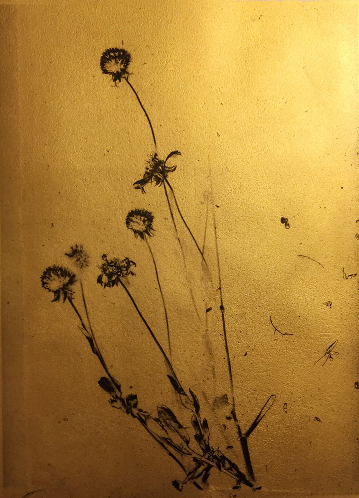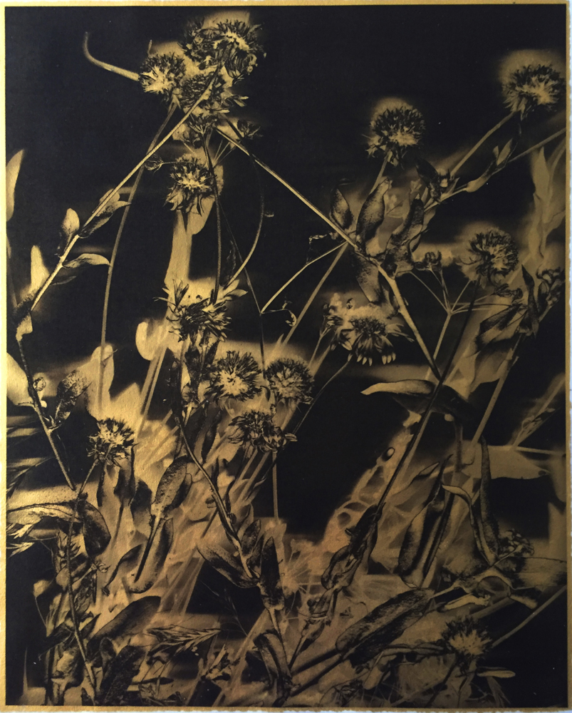 Under the umbrella of the Griffin Museum’s overarching topic of “Down Garden Paths,” Palmer’s Flora is an exploration of beauty as an antidote for personal and political crisis. Writer and philosopher John O’Donohue states, “I think that beauty is not a luxury, but that it ennobles the heart and reminds us of the infinity that is within us.” That idea resonates with me and inspired this project. The images are made from plants and flowers gathered during walks in my neighborhood or in my backyard, which are photographed, printed on vellum, and hand applied gold leaf, varnish, and wax to the prints to create the final images. The project takes reference from Anna Atkins’s botanical studies as well as surrealist photographers who manipulated imagery and materials.
