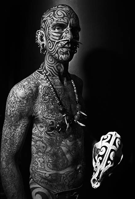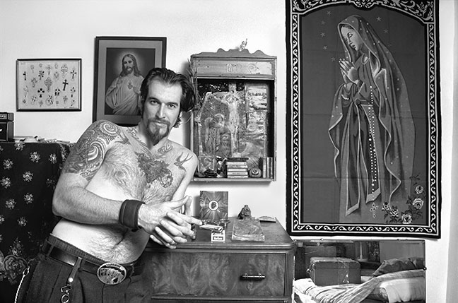 Since 1976 John Wyatt has been photographing people in their own environments who are heavily tattooed. In his own words Wyatt says, “I selected people who were dedicated to tattoo art and compiling a collection of art on their body as an art collector accumulates art for their homes. My subjects were not getting tattooed because tattooing had suddenly become popular, or fashionable. For them, it was a way of life; a culture of tattooing.” Along with each black and white photograph, Wyatt has recorded audio of his subjects that has been transcribed into exhibition text.