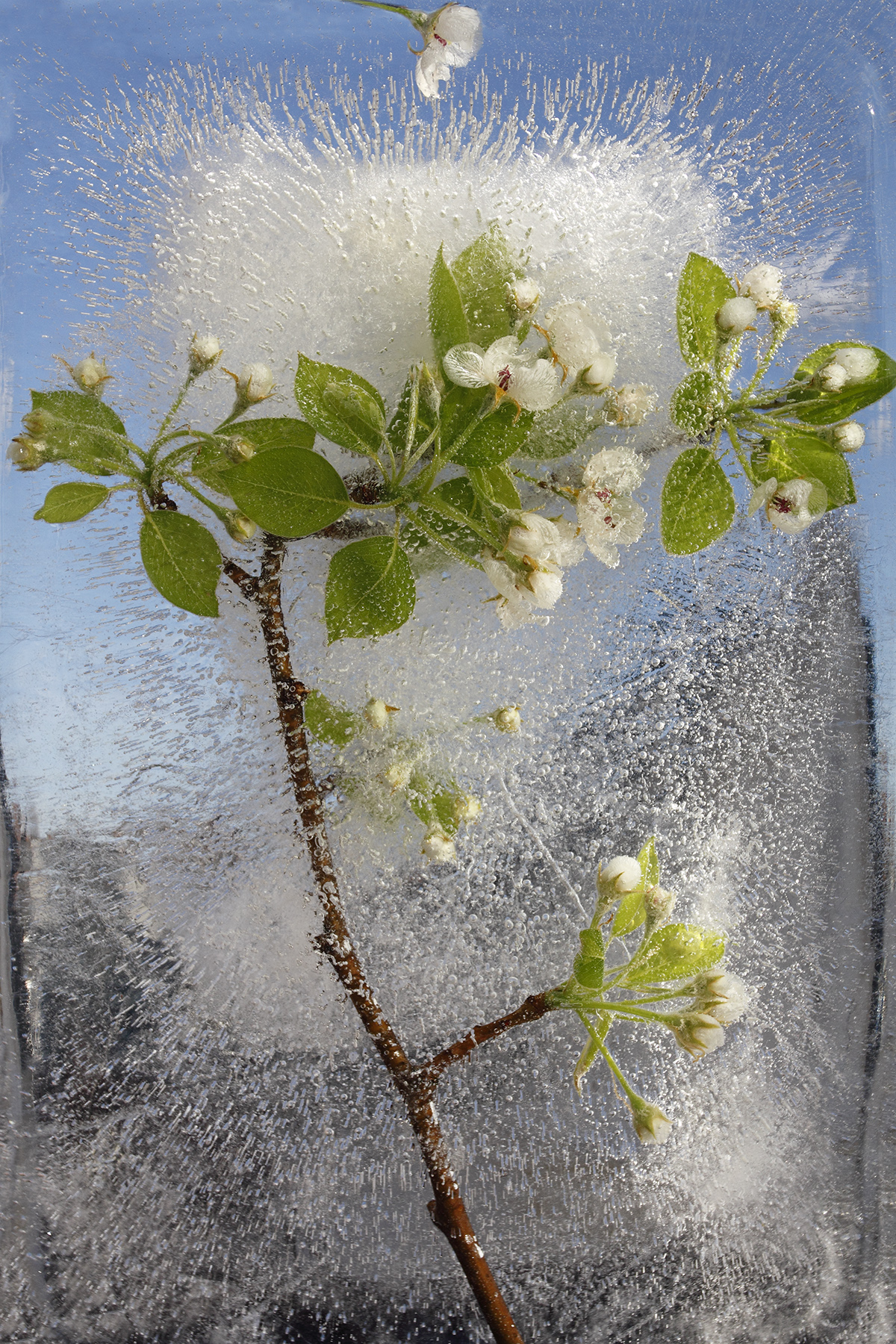 Mary Kocol says, “I am inspired by gardens within my urban midst…..The blossoms are frozen into ice and photographed in sunlight to become fanciful and ethereal constructions. Blooms and ice are temporary; the photograph becomes the permanent art object – the record that they once briefly existed.”
