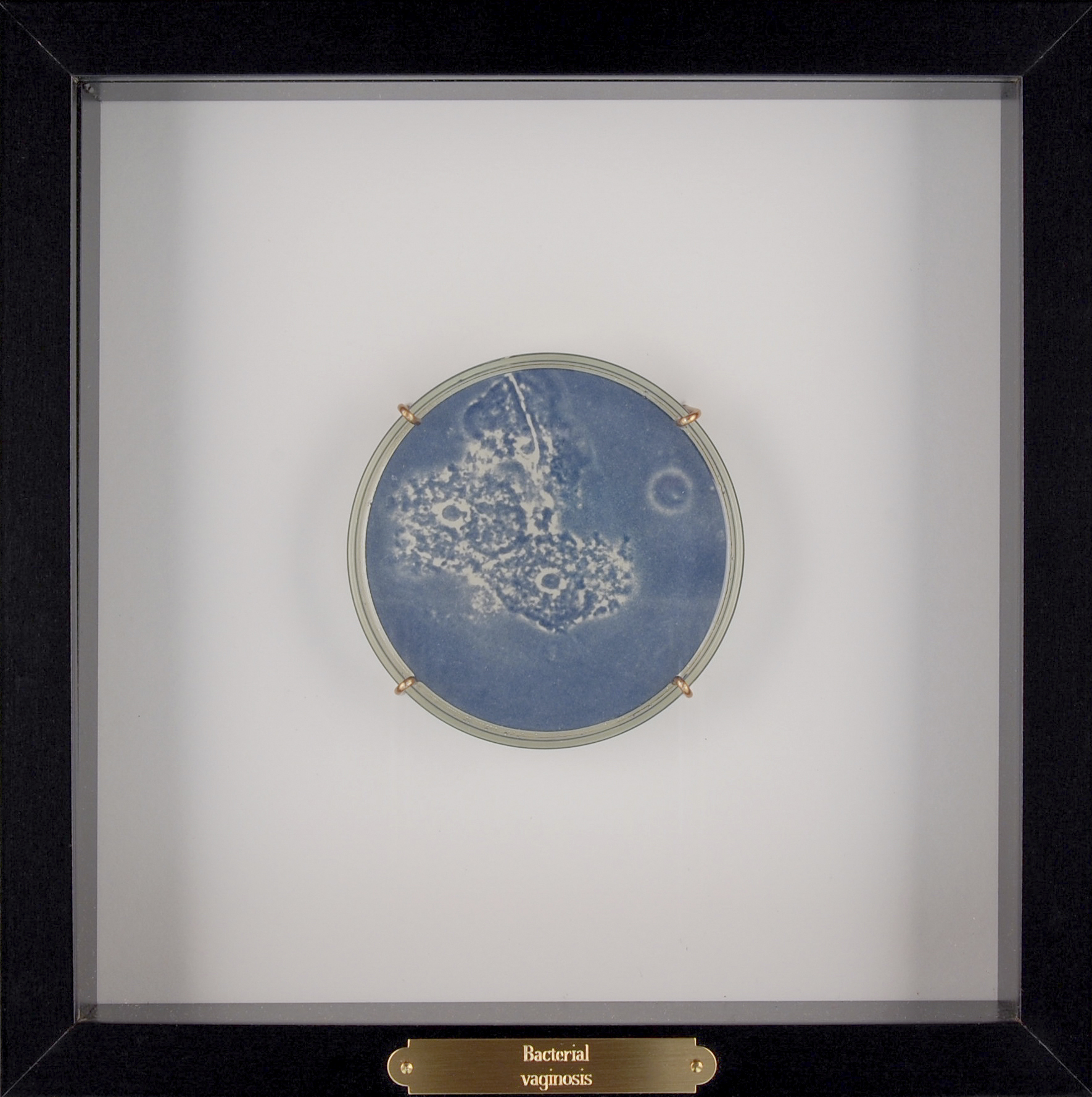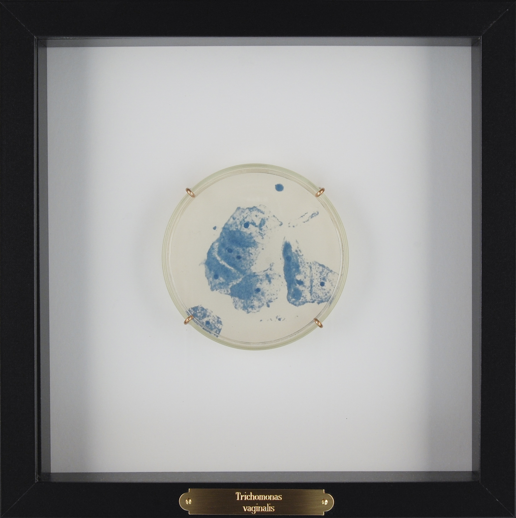 The photographs in Transmission were created using open-source imagery from the Center for Disease Control. The images are microscopic views of bacteria from sexually transmitted diseases (STDs). Beal altered the images and then converted the imagery into digital negatives. From these negatives Beal made cyanotypes and embedded the prints in resin within Petri dishes.