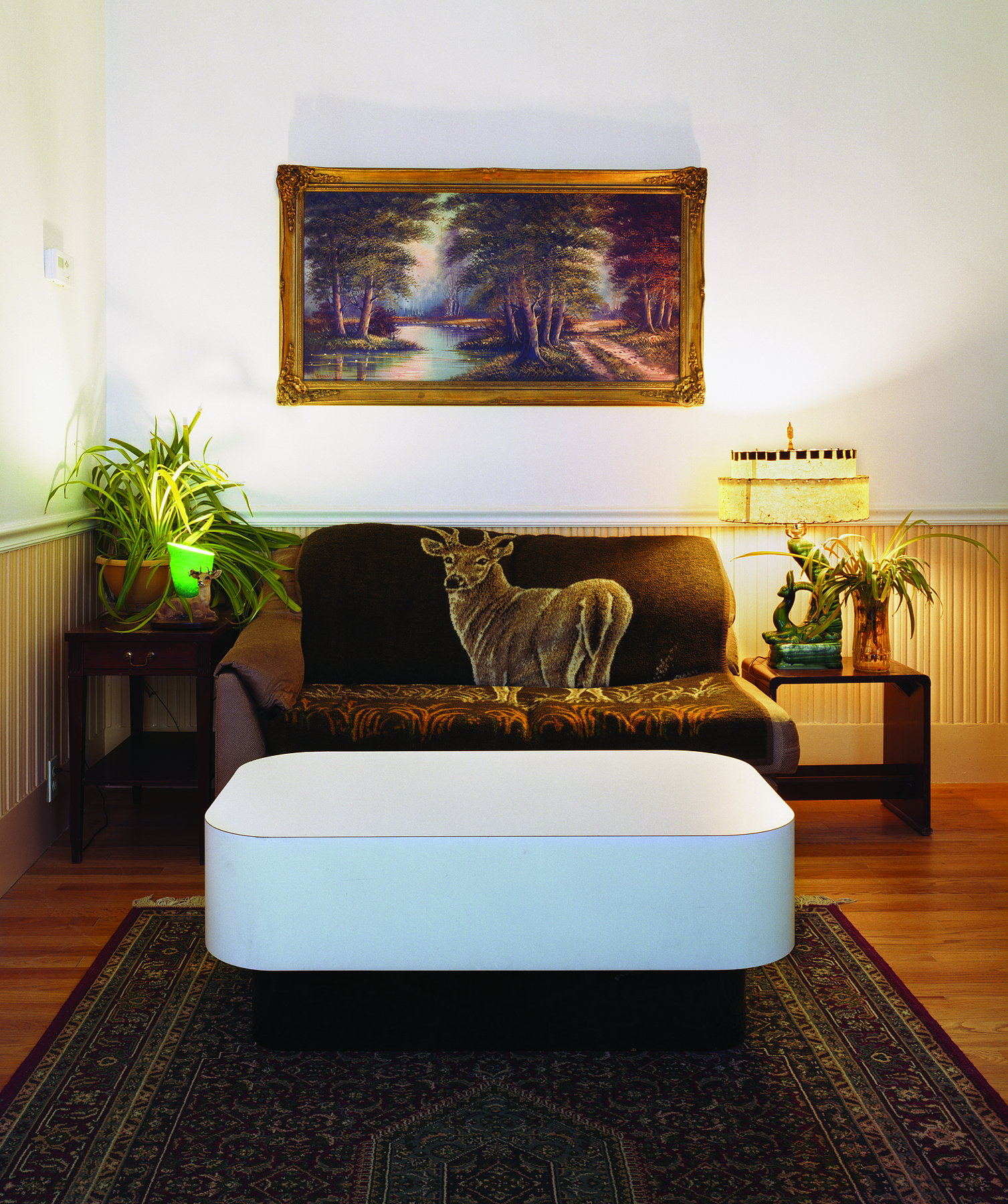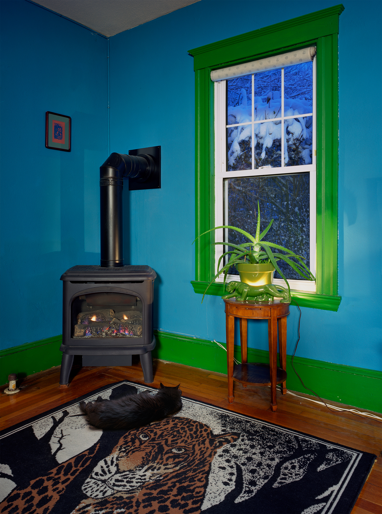 Intentionally excluding human occupants from her photographs, Malakoff says her subjects “spark curious speculation of their own. The private and personal are expressed in part by objects and signifiers which are displayed versus those which are hidden; what is allowed inside and what is kept out.’’ For example, she says, “doors and windows both frame exterior views and keep the elements at bay. Land, weather, and wildlife are ever present on the other side of the wall, even as they are brought safely inside in the form of pattern, simulation, and domesticated animals.’’ Malakoff says her photographs “speak to notions of comfort, class, and style, as well as universal attempts to control and transcend our environment.’’ There are tensions, and humor, between absence and presence, old and new, real and surreal, permanent and transient, genuine and artificial.