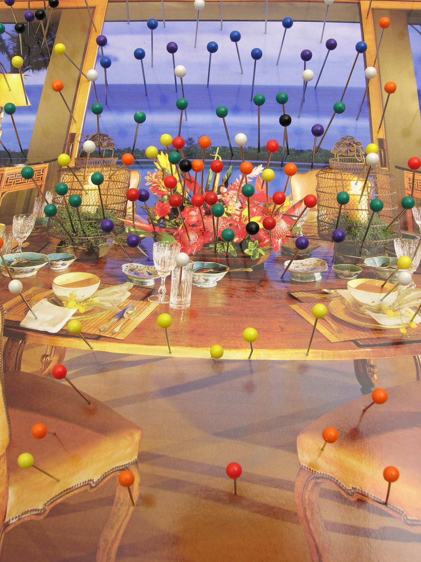 Cass says the pins “can suggest aerial views and maps, color coding, the human figure, vegetation, taxonomy and collecting, and naturally, pain.’’ He adds that the magazine imagery often evokes “a foreign world of luxury and ease that seems deeply strange to me.’’