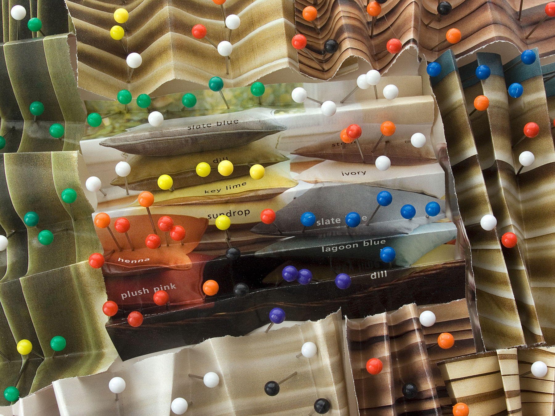 “Among other things, there is a story about color itself here; how the color of the pins match up to the color in the pieces of paper I stick them into,’’ says Cass. “And how the pins also match up to the names of colors as they appear in several of these pictures. Other pictures are monochrome; all blue magazine snippets with only blue pins, for example. In other pictures, I deliberately mismatch the pins to the areas of color I place them in. Sometimes, I think of the pins as pixels, and by placing them here and there in a pattern, it is as if I am balancing the color of my composition.’’