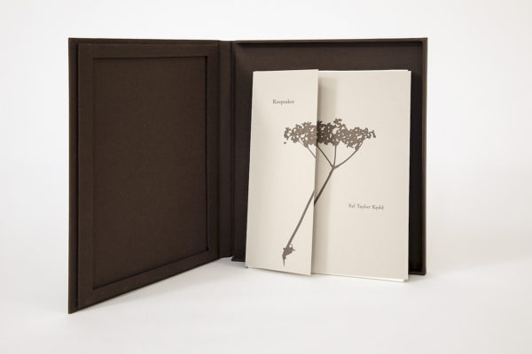 Keepsakes is a limited edition hand-made artist’s book. Each book contains 13 folios featuring archival pigment prints, text set in letterpress, and botanical print-transfers. Text and cover illustration were printed by the artist on the Vandercook Universal letterpress at Maine Media Workshops & College. Each book also comes with a limited edition platinum-palladium print. The book is presented in a hand-made box by Richard Smith of Camden Maine.