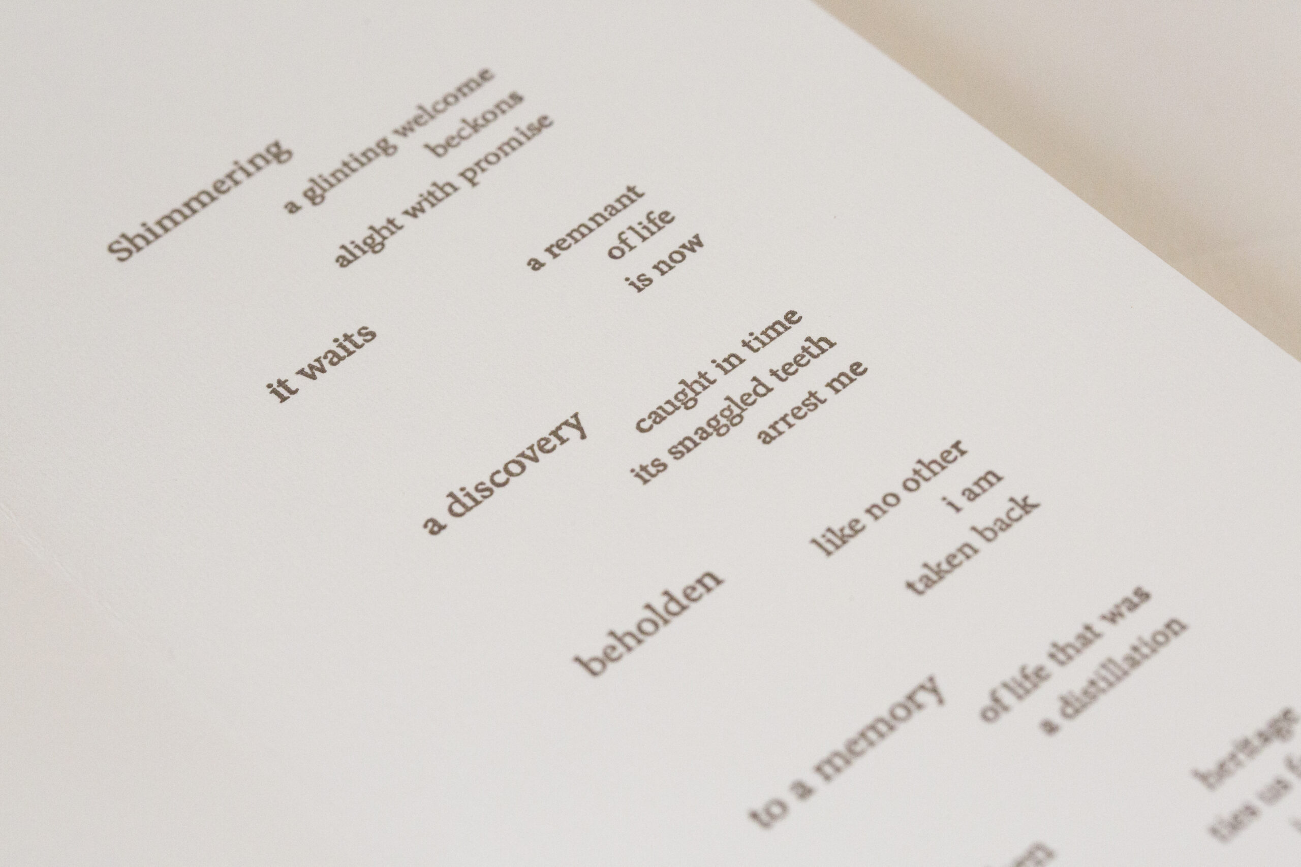 The title poem, Keepsakes, runs throughout the book from folio to folio spanning the entirety of the book. The photographs are paired with the poems as echoes of experience, as opposed to more literal illustrations. This sequencing of image and text, or absence of text, or image, sets up a pacing of the material that allows the viewer to experience the book in a series of steps, each folio can stand on its own as a keepsake, or be experienced collectively with the others in the book.