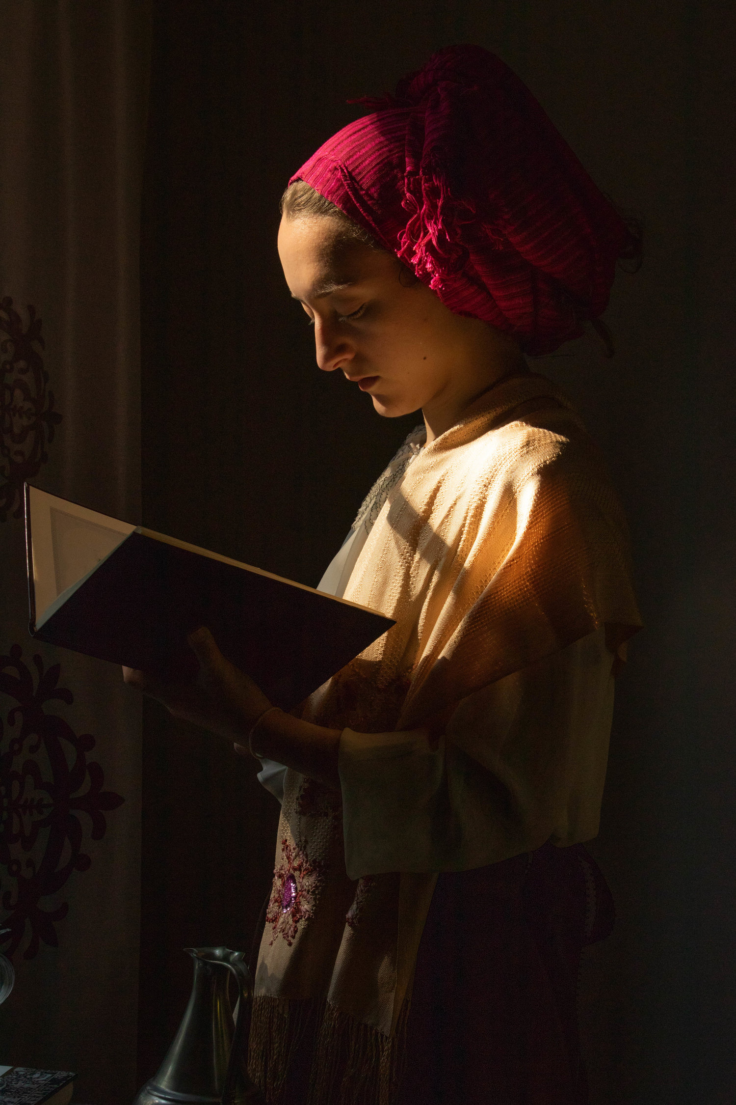 - © Becky Behar, “Wisdom” Alt Text: Portrait of young woman reading a book in window light, wearing a headpiece.
