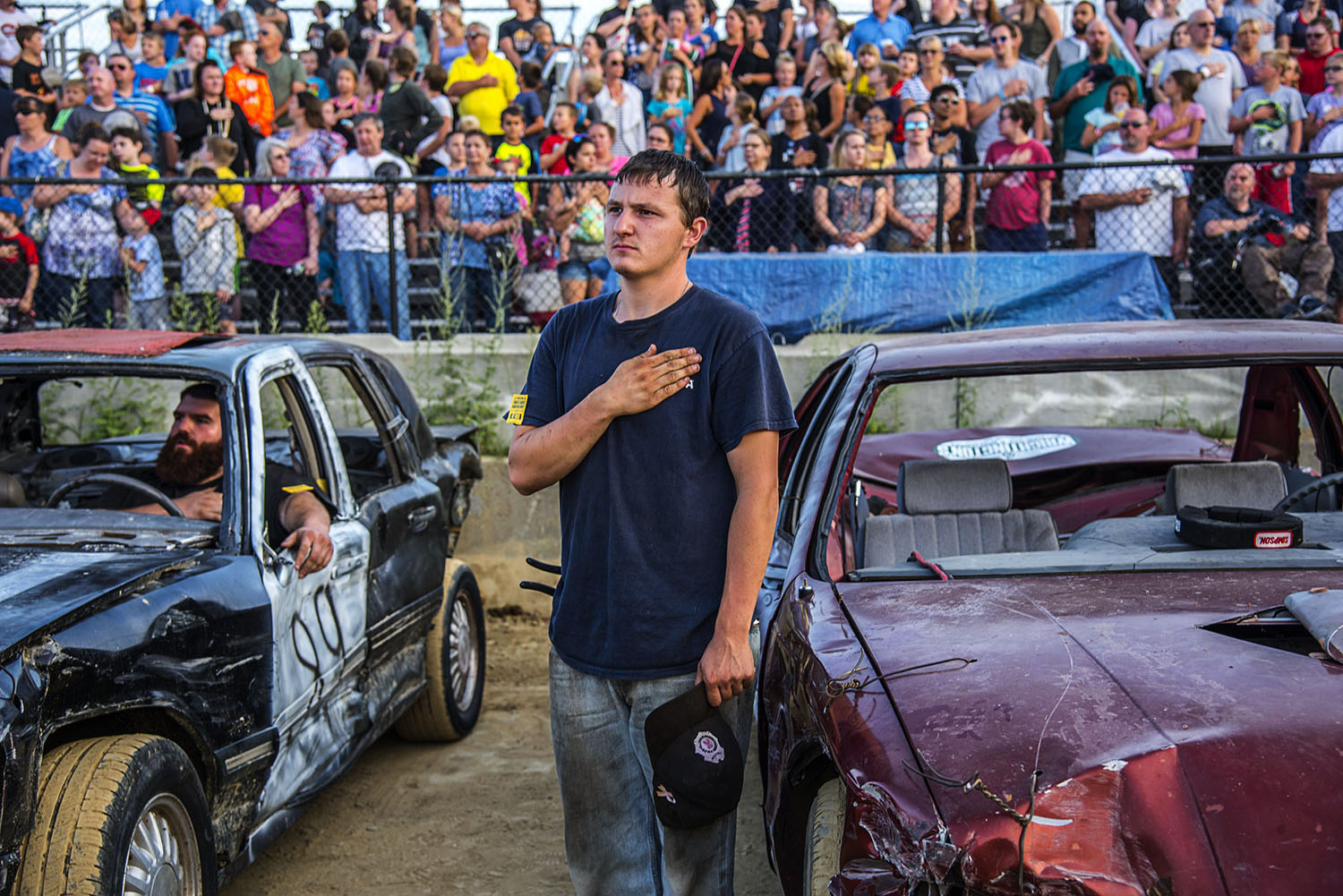 - Horizontal color photograph of race car drivers and audience with hands over their hearts while they play America the Beautiful and raise the flag at the Marshfield Fair; Marshfield; Massachusetts