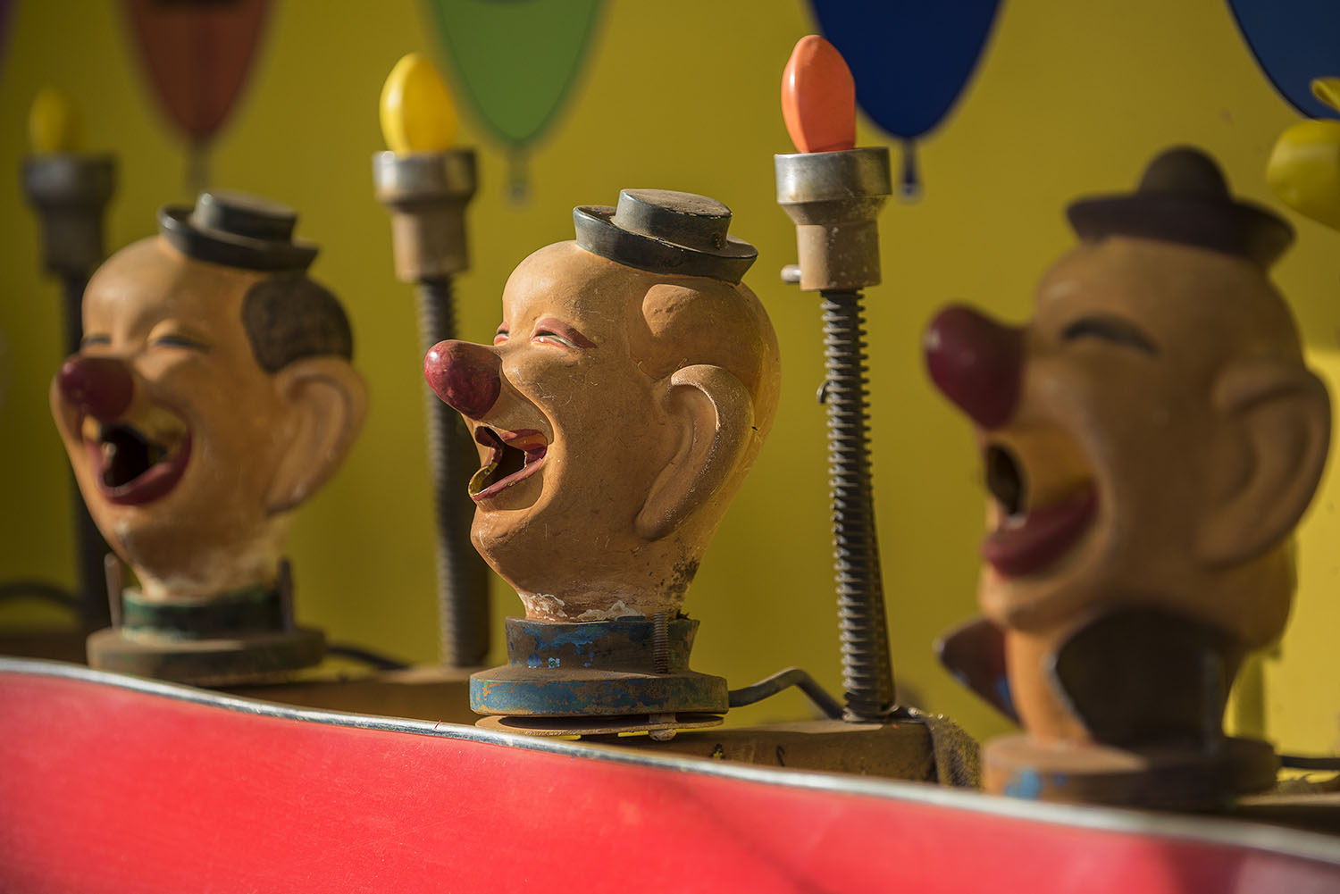 - Horizontal color photograph of shooting water thru the clowns mouth to pop the balloon first to win a prizeat the Washington County Fair, Richmond, RI