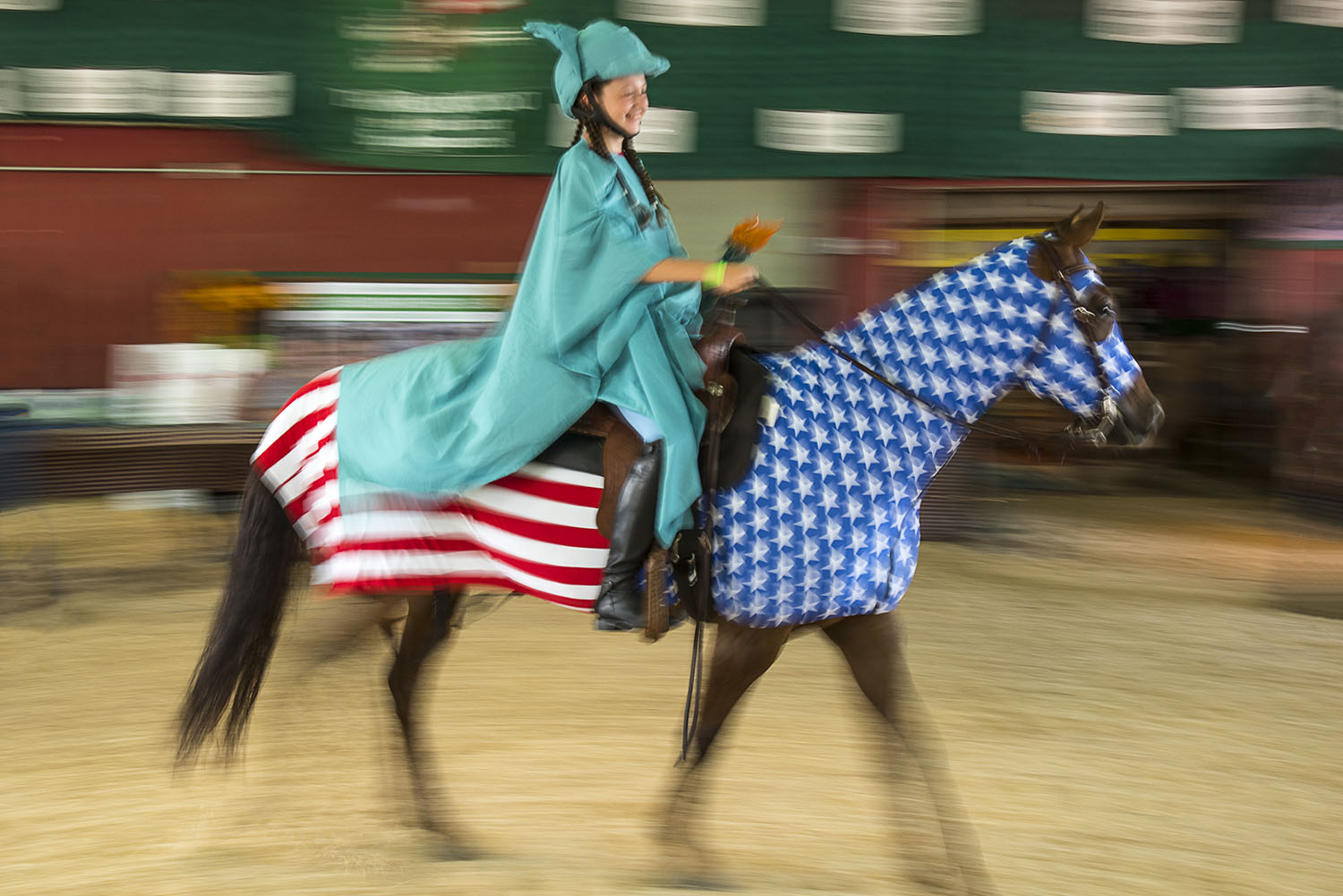 - Horizontal color photograph of a young girl in a statue of liberty costume riding her horse in a costume competition at the Vermont State Fair.
