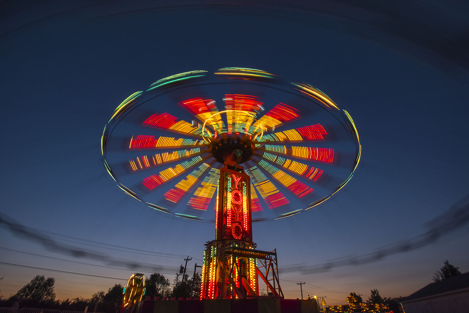 - Horizontal color photograph of Yoyo the amusement ride at night in motion with colorful lights at the Blandford Fair, MA