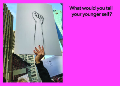 Women and girls are invited to participate – to write, draw or collage – on the pink blank part of the postcard – something they would tell their younger selves. Something she wished she had known as a younger woman.