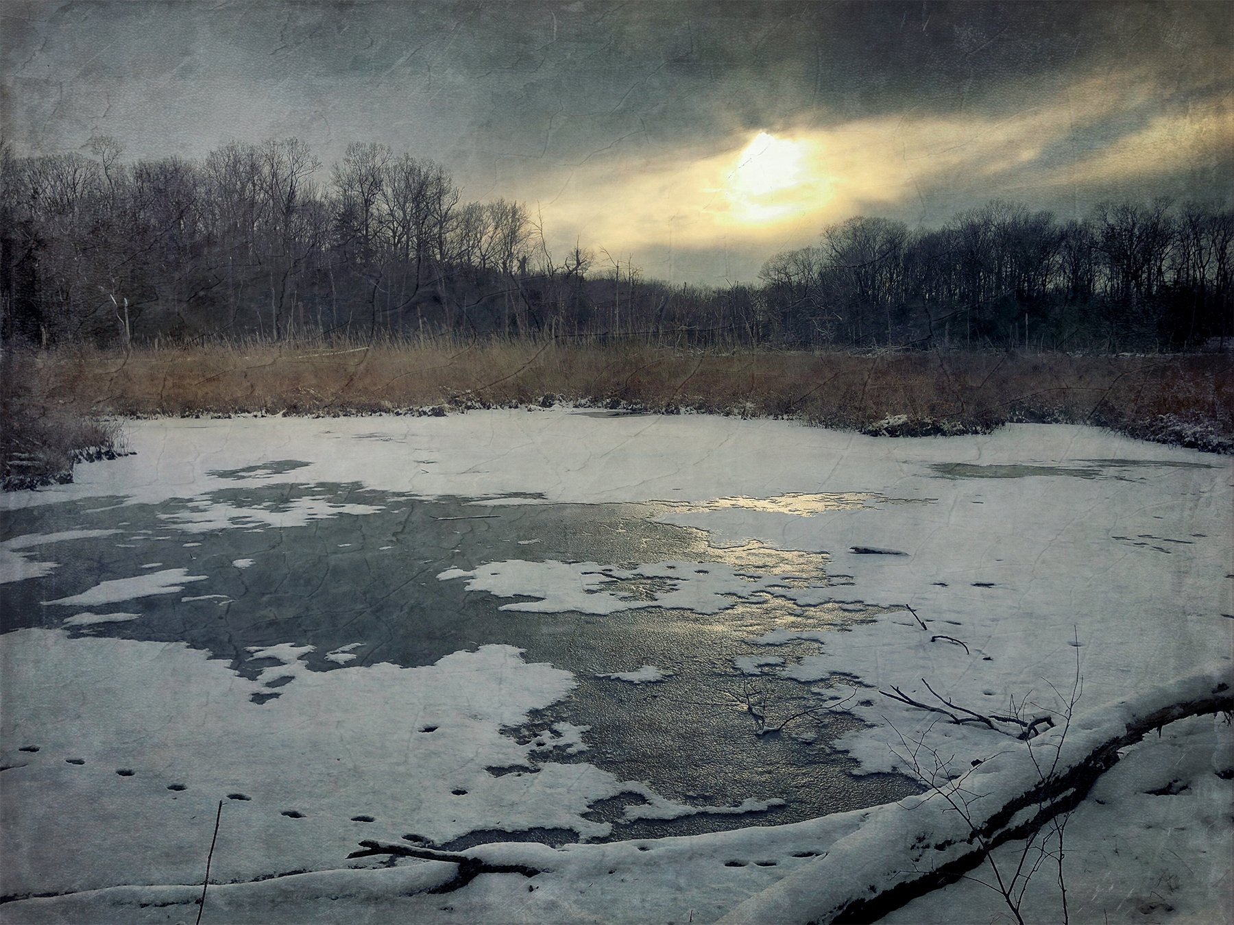 - © Karen Klinedinst, “Winter Marsh” Archival pigment print on vellum and silver leaf, 2018, $900