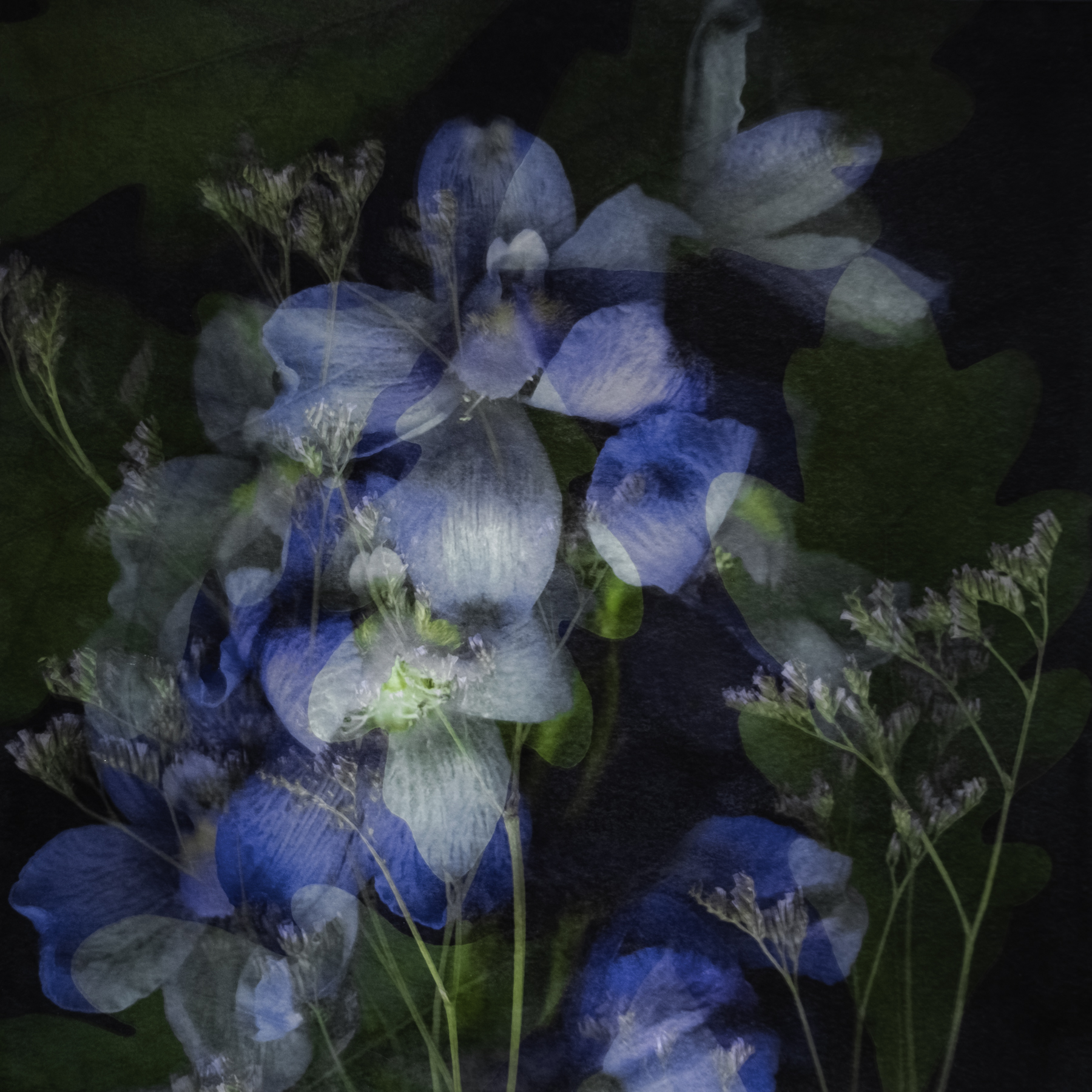 - © Marcy Juran, “Delphinium, White Oak, Sea Lavender,” Archival Pigment Print on Hahnemuhle Bamboo, encaustic on board, 2019, $450